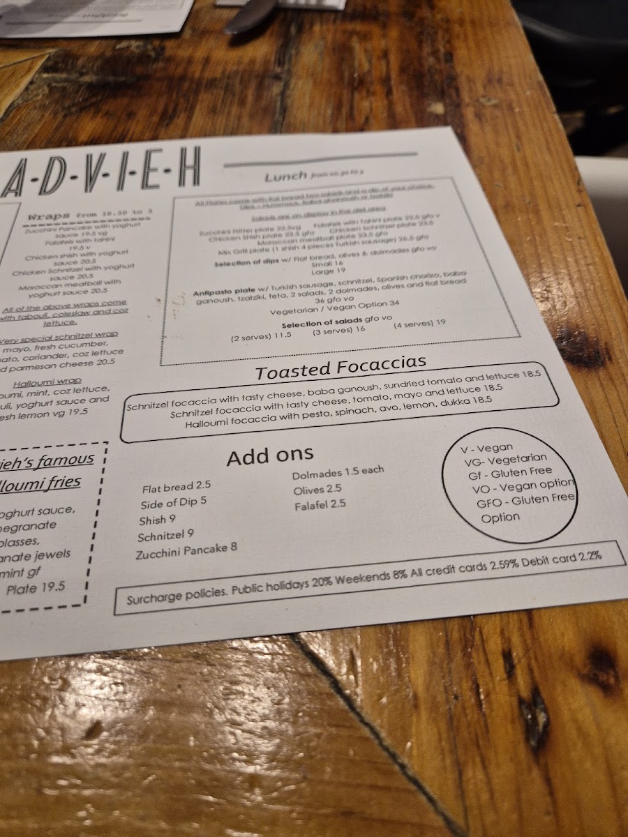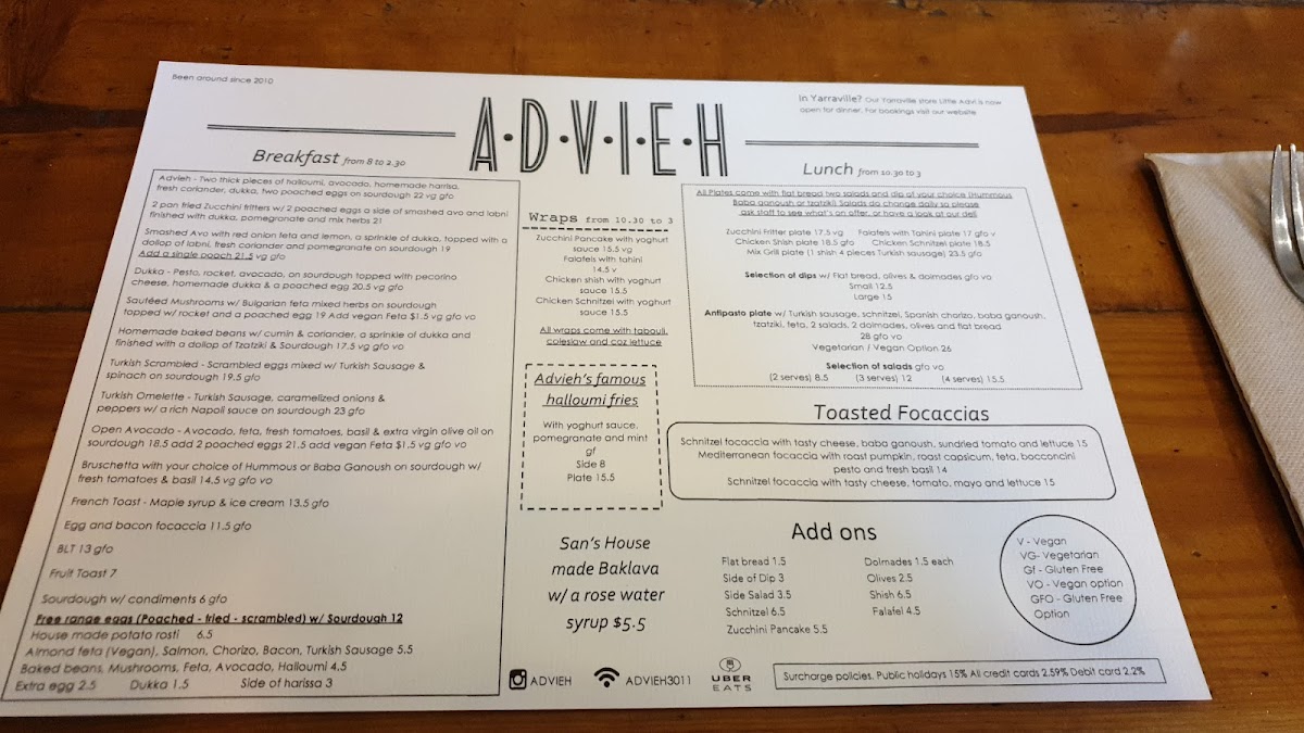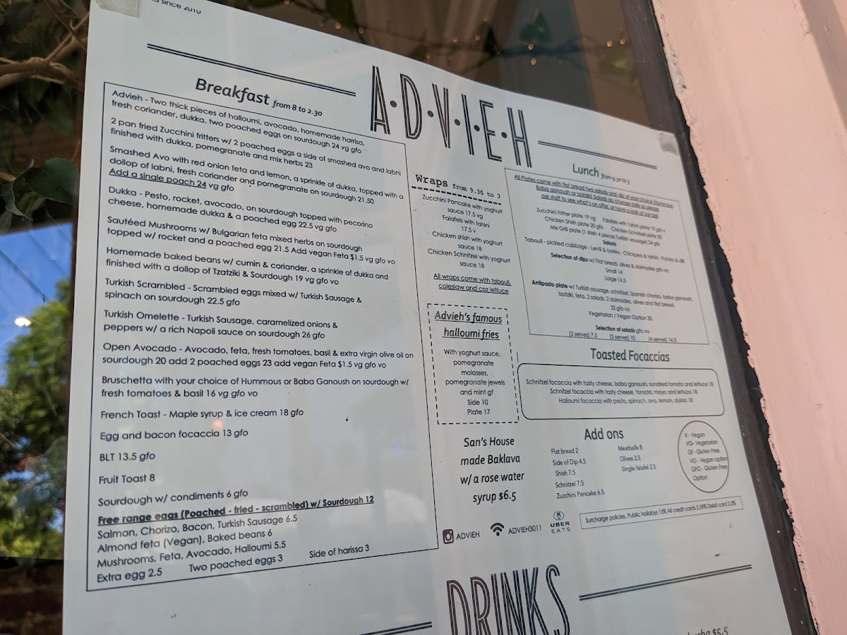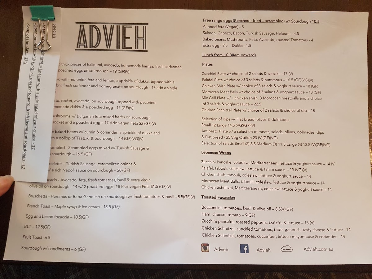 Welcome to Advieh, a charming café located at 71B Gamon St, Seddon, VIC. This culinary gem seamlessly combines a Turkish flair with a diverse menu that delights the senses. Start your day with their famous Shakshuka, a flavorful medley of tomatoes and spices, perfectly complemented by fluffy bread. For a lighter lunch, try the generous Halloumi Wrap or the satisfying Falafel Plate, both expertly crafted with fresh ingredients. Don't miss the Tahini and Date Smoothie, a creamy blend of tahini, banana, and honey that creates a refreshing burst of flavor.